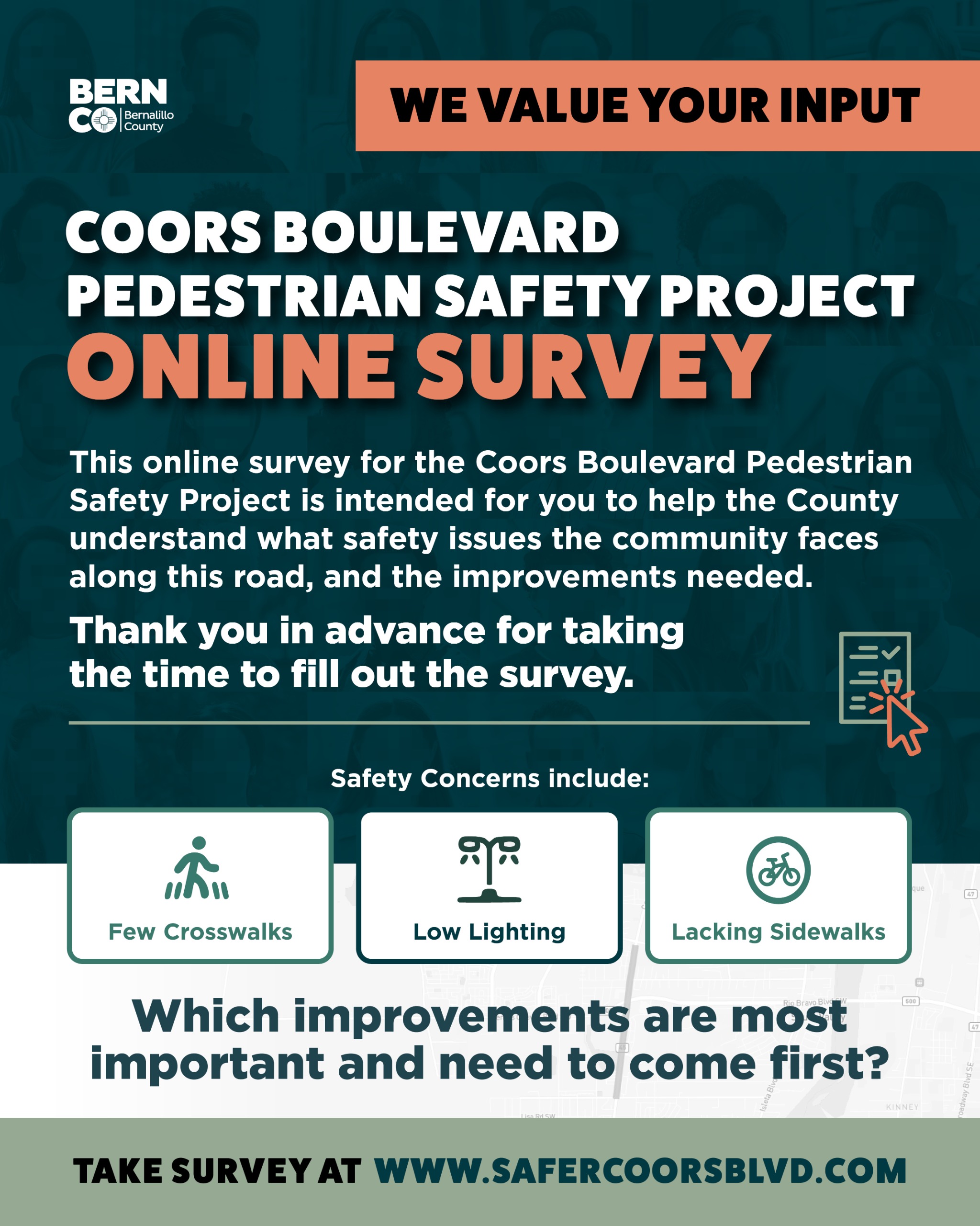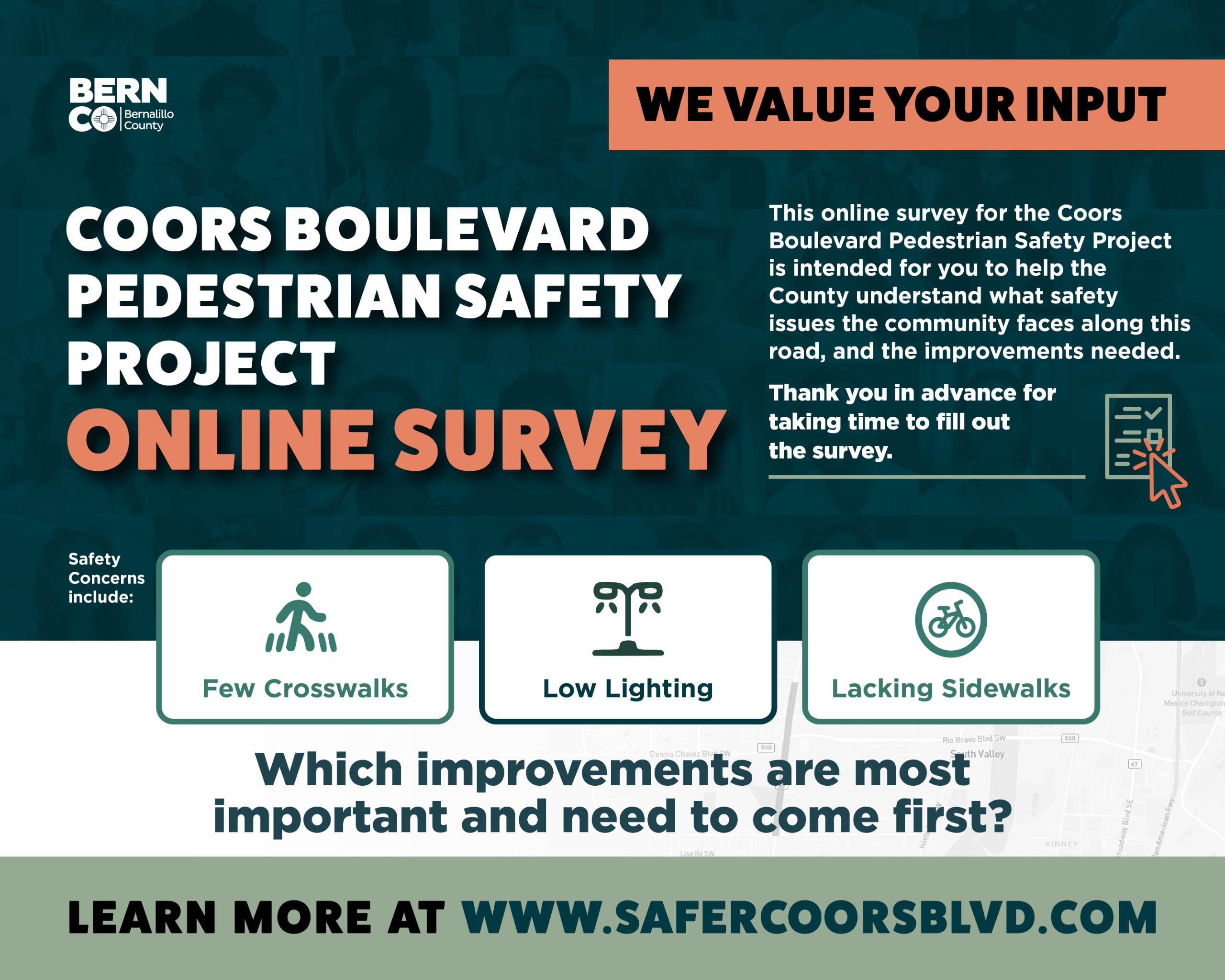 This online survey for the Coors Boulevard Pedestrian Safety Project is intended for you to help the County understand what safety issues the community faces along this road, and the improvements needed.